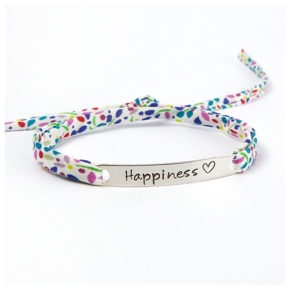 Bracelet avec message gravé sur plaque argent 925. Cordon Liberty à nouer 100% coton.